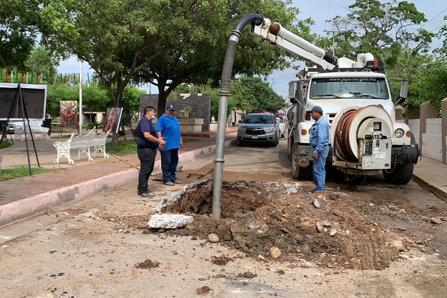 En primera instancia se acudió con el camión vactor a tratar de limpiar la red pero al no lograrlo se optó por demoler el concreto de la avenida Ignacio Allende a fin de buscar el taponamiento y retirarlo de forma manual, pero al empezar a excavar se pudieron percatar que las paredes de las tubería estaban destrozadas, por lo que hasta el día de hoy personal adscrito al área de drenajes con apoyo de la maquinaria del H. Ayuntamiento de Elota, continua realizando los trabajos para encontrar y sustituir los tramos de tubería afectada.