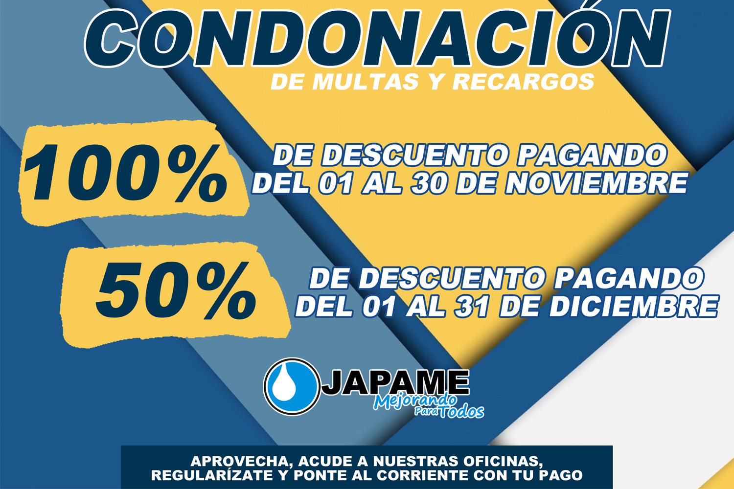 La Cruz, Elota, Sinaloa.- Con el propósito de regularizar a usuarios que cuentan adeudos vencidos por los servicios de agua potable, alcantarillo y saneamiento, les informamos que a partir del primero de noviembre y durante todo diciembre, japame estará efectuando la condonación de multas y recargos, por ello, si usted presenta algún pago atrasado ante esta paramunicipal, le hacemos extensiva la invitación, para que pase a nuestras oficinas y aproveche los descuentos del 100% pagando en noviembre y del 50% durante todo diciembre.